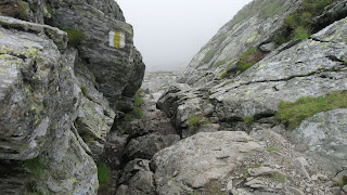 Nu inteleg de ce, ca sunt atatea pietre mari unde se putea pune marcajul. Am avut noroc ca s-a ridicat ceata si am vazut oarecum directia in care trebuia sa o luam. Am continuat de-a dreptul prin caldarea stancoasa si dupa aproape o ora am iesit fix la un indicator.